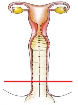 Como mostrei na na outra imagem, o clitóris circula o canal vaginal, e é ele que causa o prazer na mulher. Porém a extensão dele que circula o canal da vagina é de aproximadamente 5 cm. Depois disso não tem inervação no canal vaginal, ou seja, a mulher não sente absolutamente nada naquela região acima da linha vermelha até chegar ao útero.